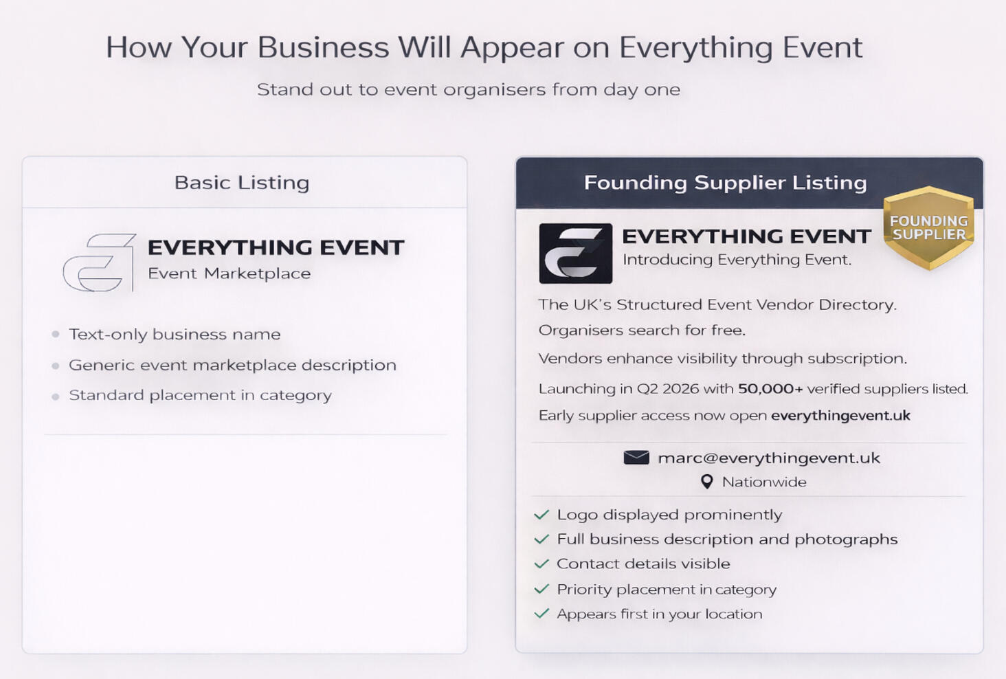 Stop relying on outdated directories to get found. Everything Event is a new UK-wide platform connecting Event Organisers with the right suppliers. Launching in Q2 2026 with 50,000 + verified suppliers listed (many venues + Event Organisers included). Be visible to organisers actively searching for your service - in the right category, in the right location.No commission on bookings | No pay-per-lead or bidding | Built for all event types across the UK